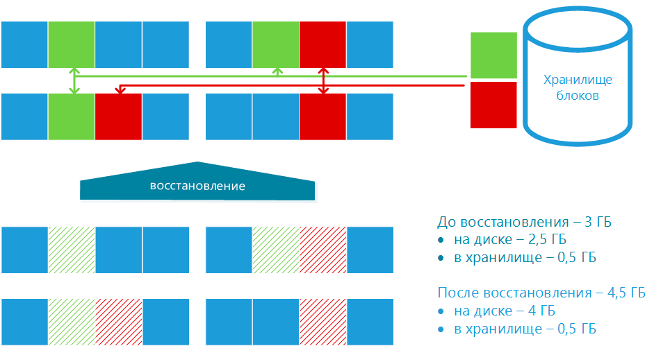 В нашем примере степень дедупликации составила 25%, при этом объем данных на диске уменьшился с 4 ГБ до 2,5 ГБ, но еще 0,5 ГБ оказалось помещено в хранилище.