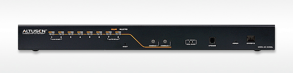 Переключатель выполнен в формате 1U и может быть смонтирован в стойку. На передней панели находятся кнопки переключения выходов, индикатор активного порта, разъем для обновления прошивки, индикатор питания и кнопка Reset.