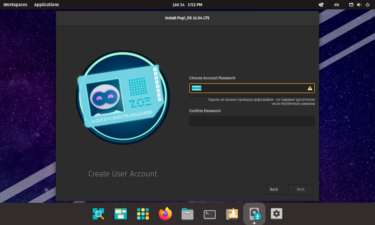 Требования к паролю также, нетипично для Linux, высоки. Простой пароль, наподобие 123 вам установить не удастся, даже если вы ставите систему в тестовых целях.