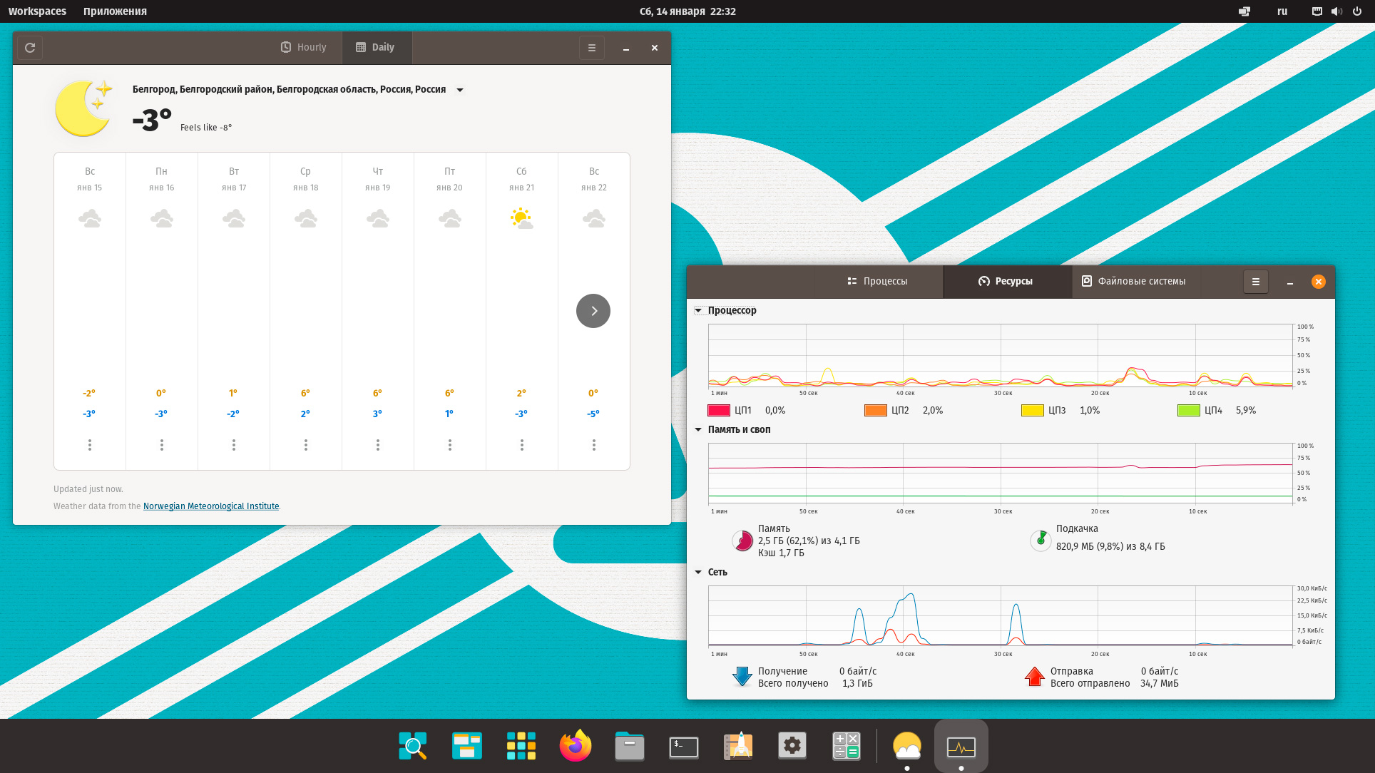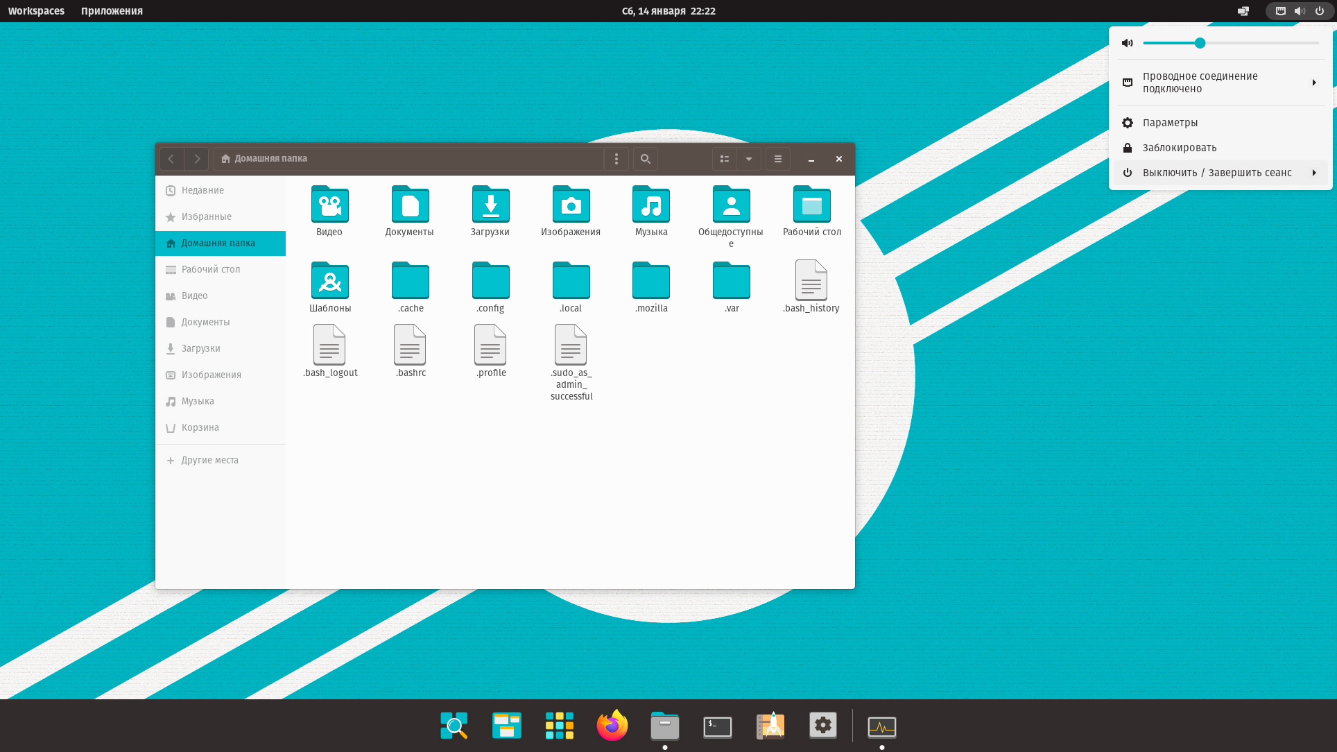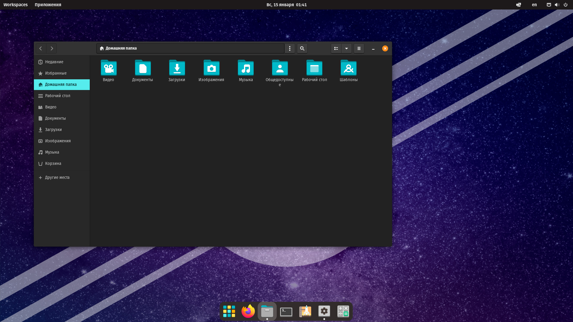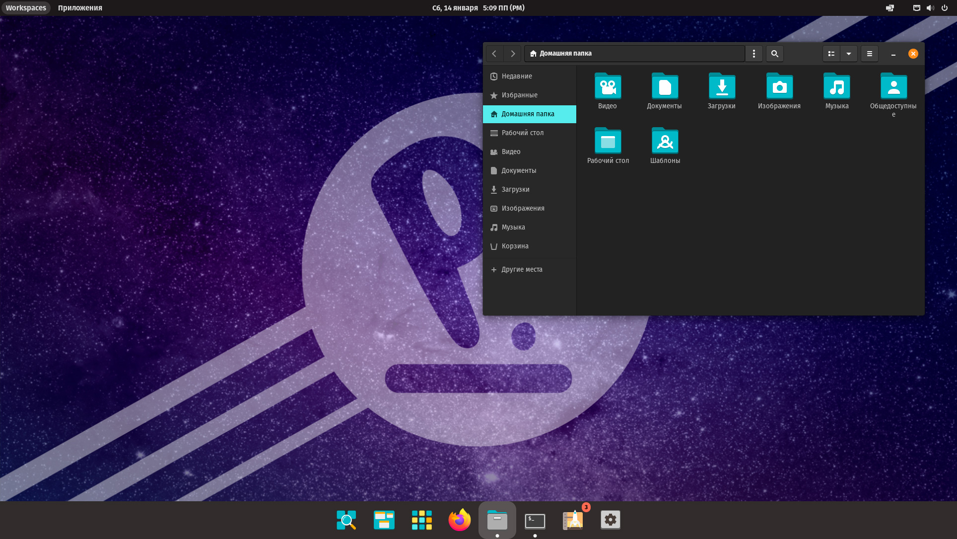 Для доступа к программам используется всплывающее меню, которое, в отличии от классического гномовского не разворачивается на весь экран, такое поведение нам нравится больше, особенно на больших экранах. Меню настраиваемое, вы можете создавать собственные папки и распределять значки по группам в соответствии с собственными предпочтениями.