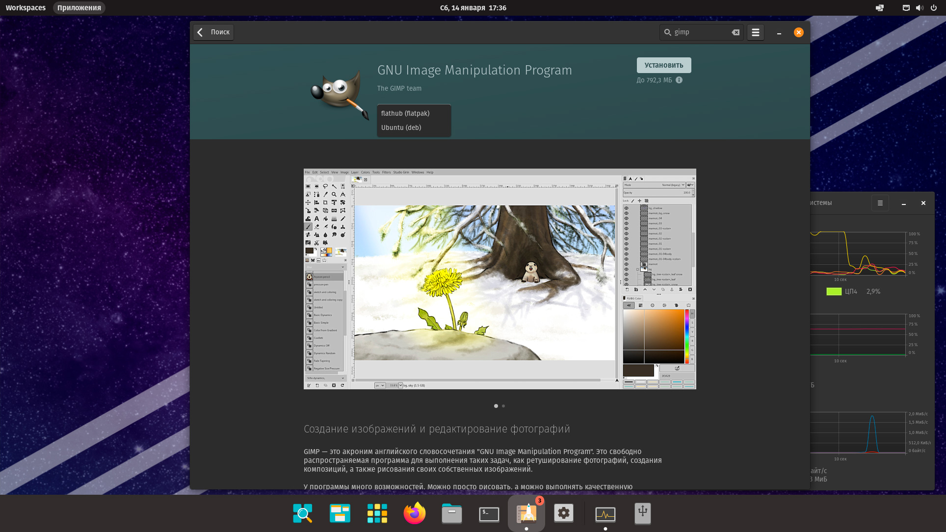 Для установки и управления софтом в системе предусмотрен собственный магазин Pop!_Shop, в качестве источников предлагаются репозитории Ubuntu и Flatpak, последний является предпочтительным. Но при этом во многих случаях пользователь имеет возможность выбирать источник самостоятельно.
