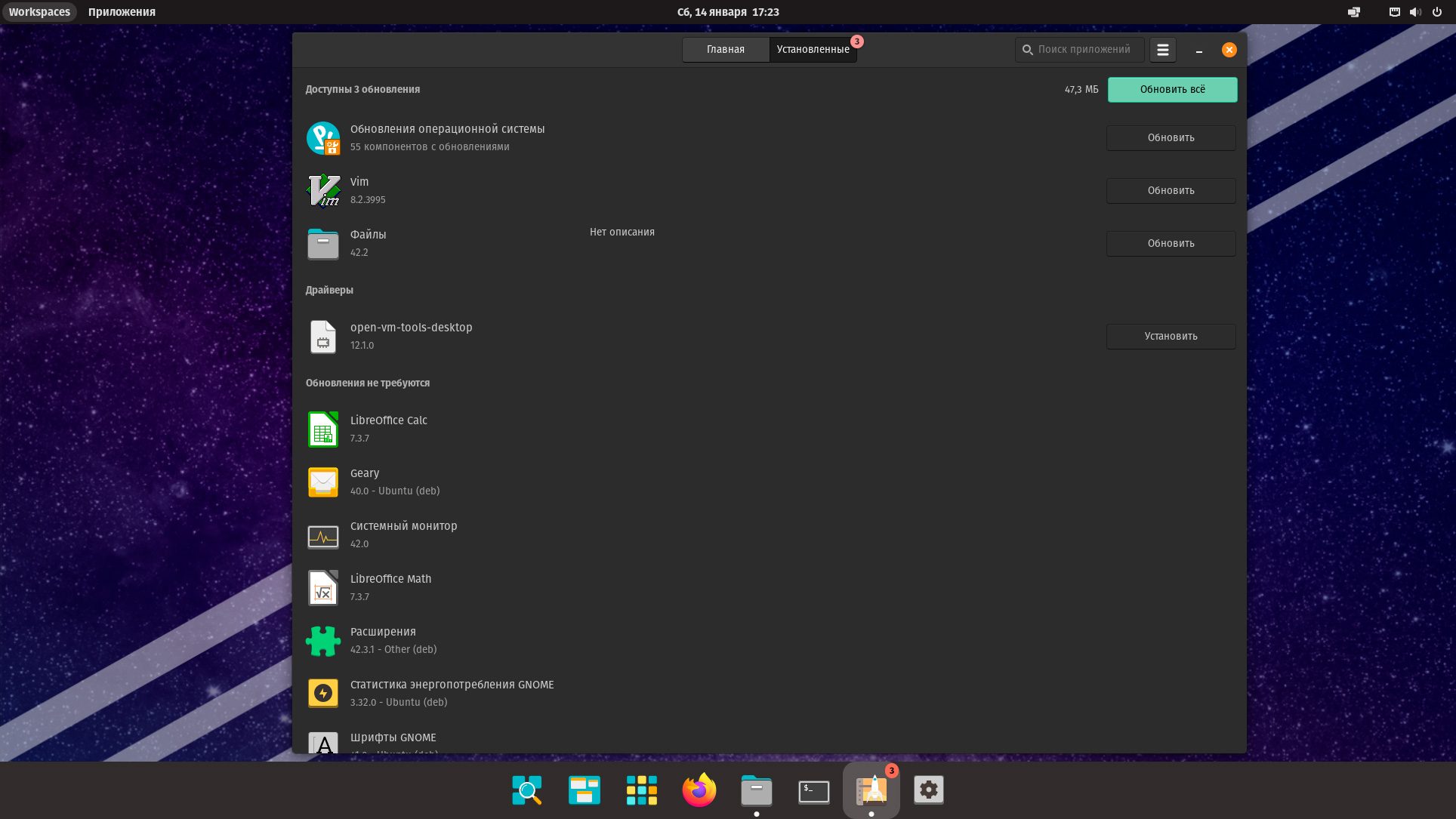 Через Pop!_Shop также можно производить обновление системы, также можно заметить, что ОС определила то, что запущена в виртуалке и автоматически предложила нам установить пакет драйверов для расширенной поддержки.