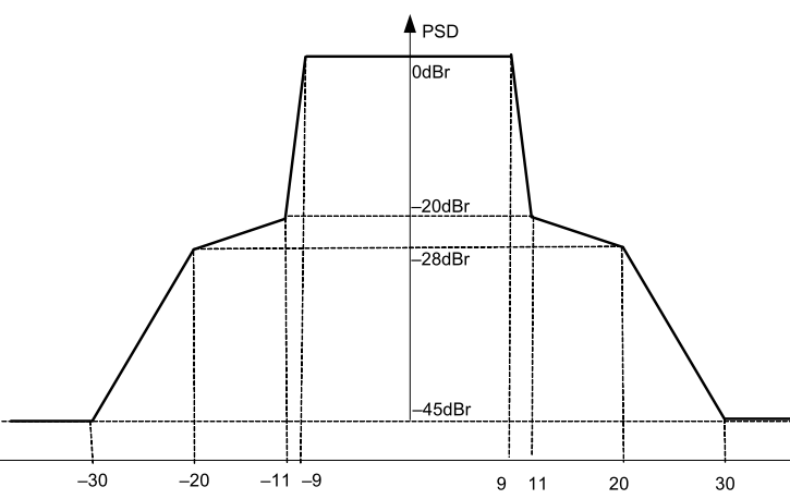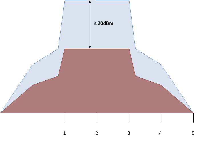 На время оторвемся от наших аналогий и немного углубимся в теорию электросигналов. Распределение передаваемой энергии в частотном диапазоне называется спектром сигнала, ниже приведена типовая спектральная маска Wi-Fi канала шириной 20 МГц.