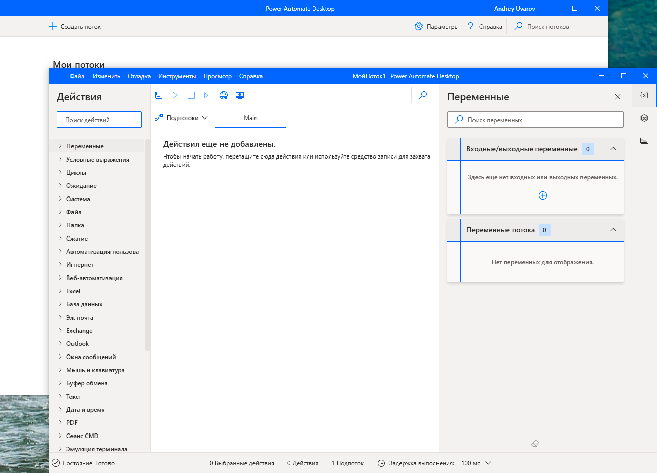 Рабочее пространство организовано достаточно просто, слева представлены доступные действия, разделенные по группам, в центре список действий потока, справа переменные. Все достаточно просто и удобно.