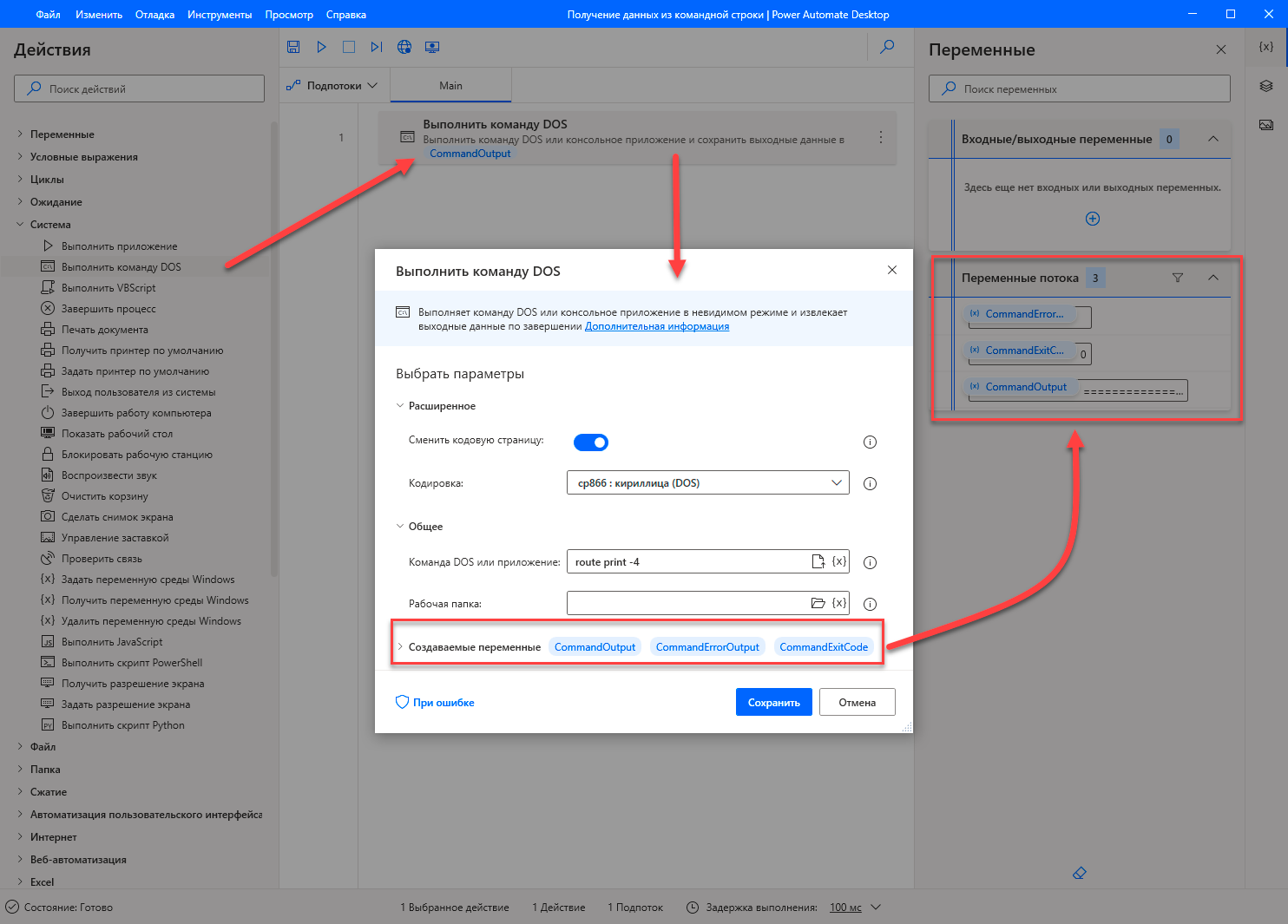 Внизу окна указаны переменные, которые будут добавлены в поток нашим действием, их три: вывод команды, вывод сообщения об ошибке и код завершения команды. Все они будут доступны в правой колонке.