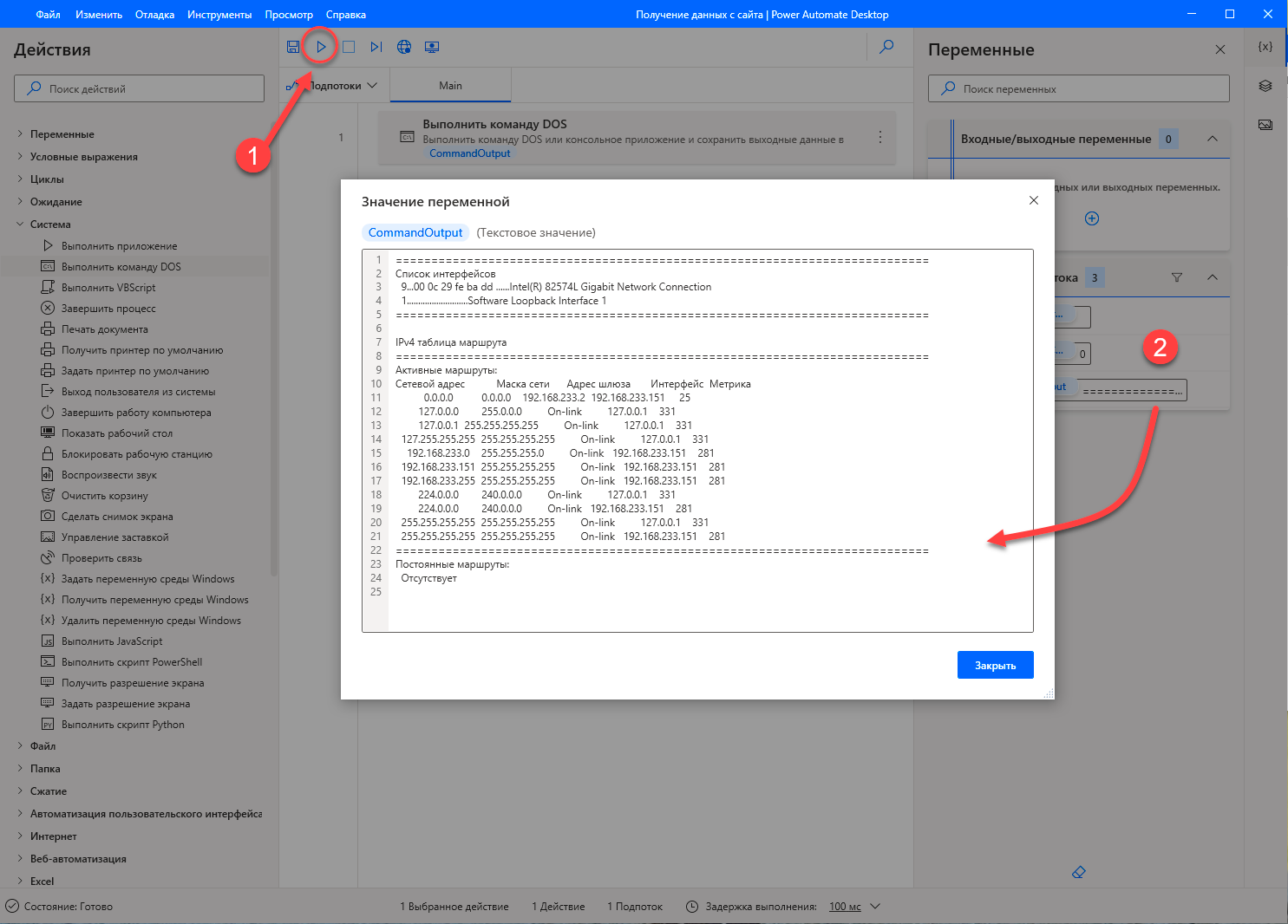 Теперь можно запустить отладку действия нажав кнопку Выполнить в верхнем ряду пиктограмм. После чего можно открыть нужную переменную и посмотреть ее содержимое. Как видим вывод команды получен из консольного приложения и хранится в одной из переменных потока.