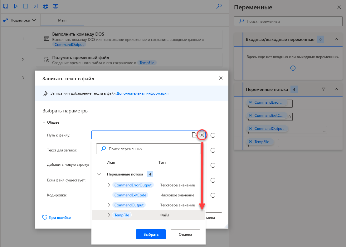 А мы тем временем двинемся дальше, чтобы записать текст в файл нам потребуется его создать, для этого перетащим в поток действие Файл - Получить временный файл, которое добавит новую переменную TempFile с именем временного файла. Затем добавим еще одно действие, Файл - Записать текст в файл, в настройках которого укажем в качествеПути к файлу переменную TempFile, а в качестве Текста для записи переменную CommandOutput.