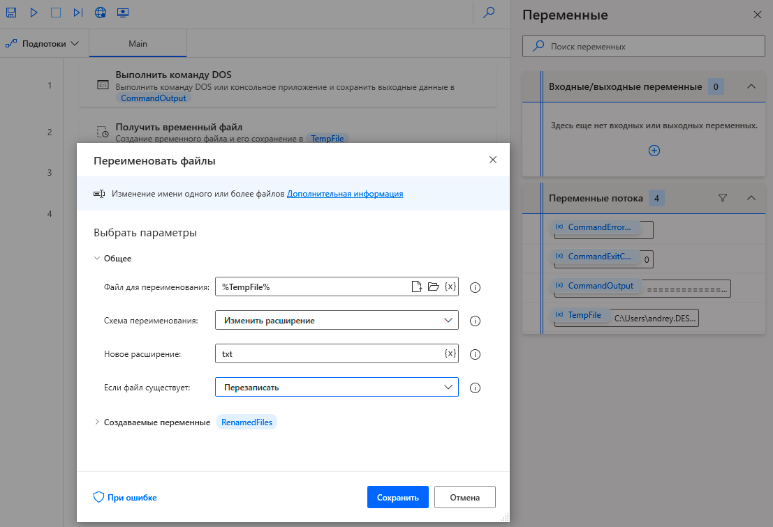 Выполним сценарий и откроем файл, указанный в переменной TempFile, в нем должен оказаться вывод команды. Ну так давайте же отправим его на печать! Но нет, есть одна проблема, он имеет расширение tmp и если мы попытаемся напечатать его, то система сообщит нам, что не знает как его открыть. Поэтому давайте переименуем его в обычный текстовый файл. Для этого используем действие Файл - Переименовать файлы. В качестве Файла для переименования снова укажем переменную TempFile, в Схеме переименования - Изменить расширение, Новое расширение - txt. В поток добавится новая переменная - RenamedFiles, но в отличии от TempFile это не путь к файлу, а список путей к переименованным файлам, пусть и состоящий из единственной строки.