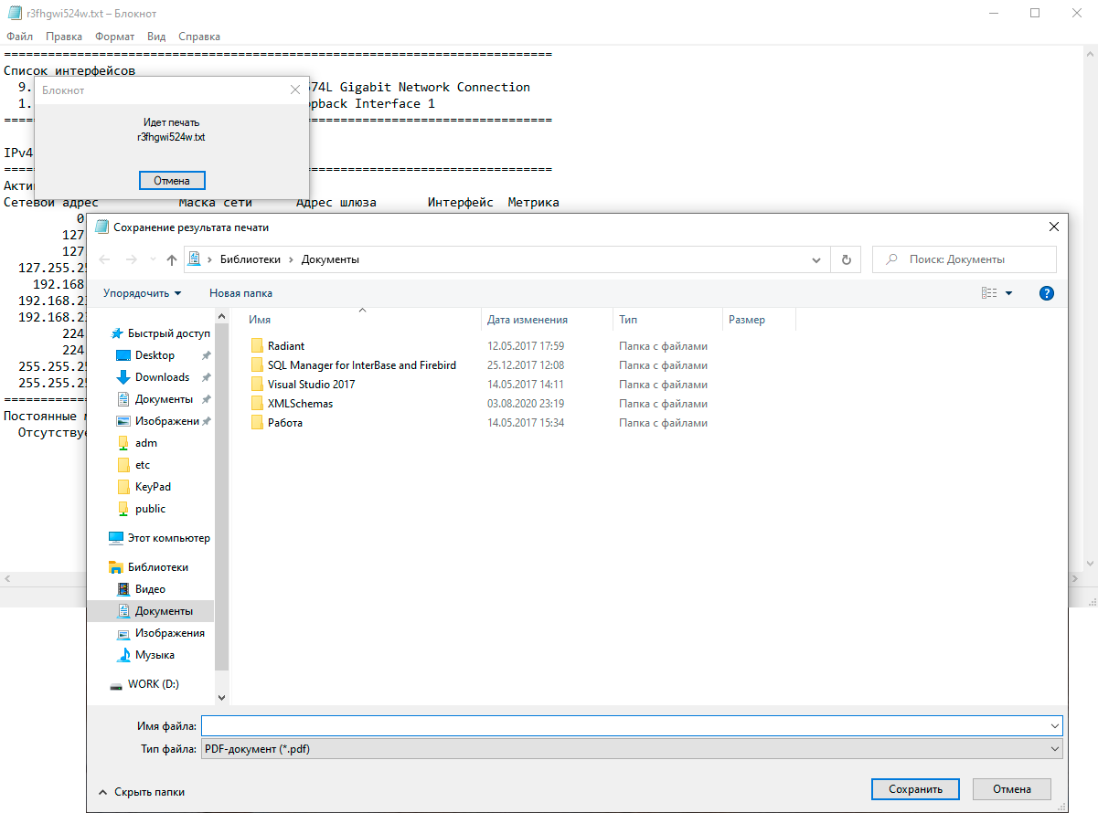 Если теперь мы выполним наш поток, то увидим, что откроется Блокнот с содержимым нашего файла и будет выполнена стандартная процедура печати на принтер по умолчанию, в нашем случае использован принтер Microsoft Print to PDF, поэтому идет сохранение результата печати в файл.
