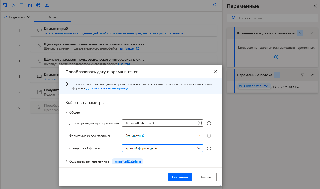 Но мы не можем добавить дату к строке имени файла, поэтому нам нужно предварительно преобразовать ее в строку нужного формата. Для этого используем действие Текст - Преобразовать дату и время в текст. В поле Дата и время для преобразования укажем переменную CurrentDataTime, а в поле Стандартный формат укажем Краткий формат даты. Результат преобразования будет присвоен новой переменной FormattedDateTime.