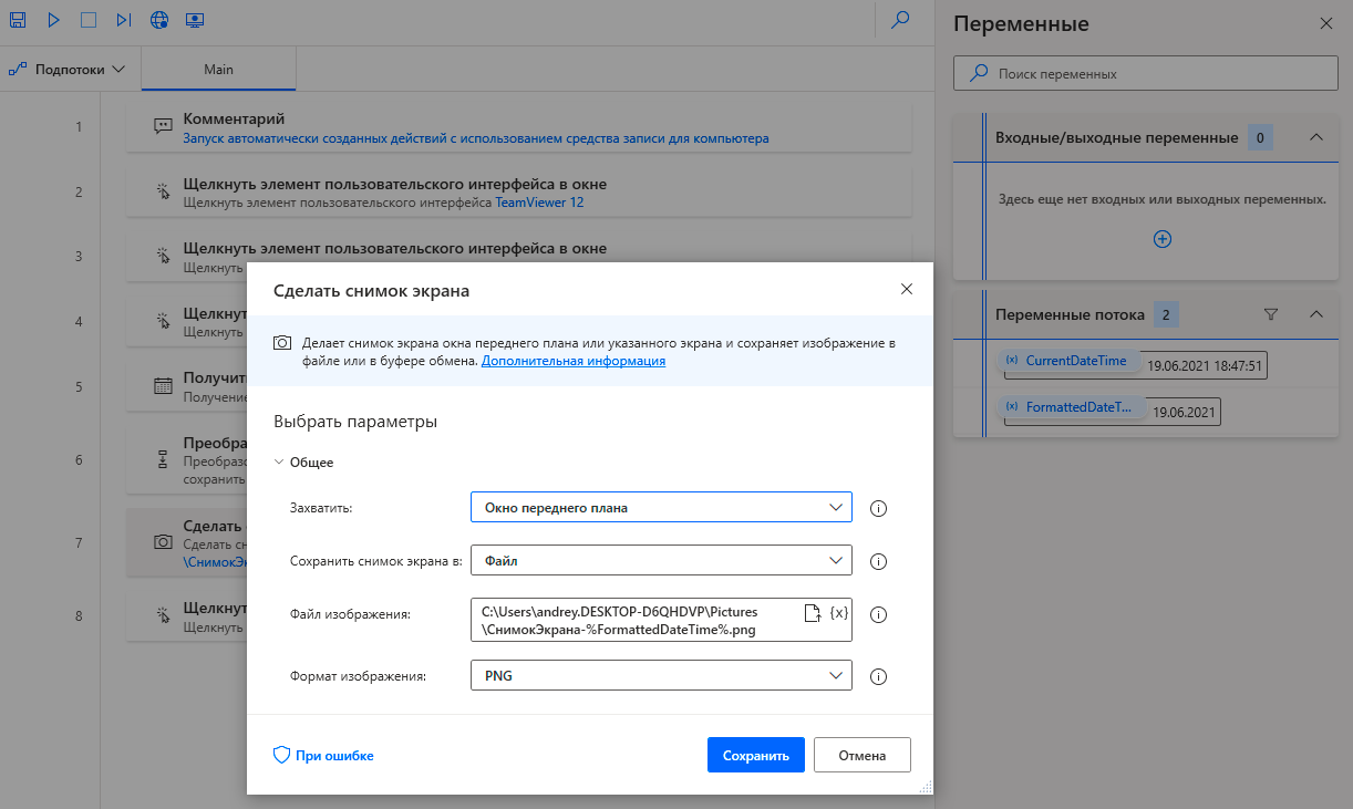 Теперь перетащим в поток действие Система - Сделать снимок экрана. В настройках укажем, что нам нужно захватить Окно переднего плана, сохранить его в Файл, выберем формат изображения и в поле Файл изображения выберем путь и имя сохраняемого файла, после чего дополним его переменной с текущей датой.