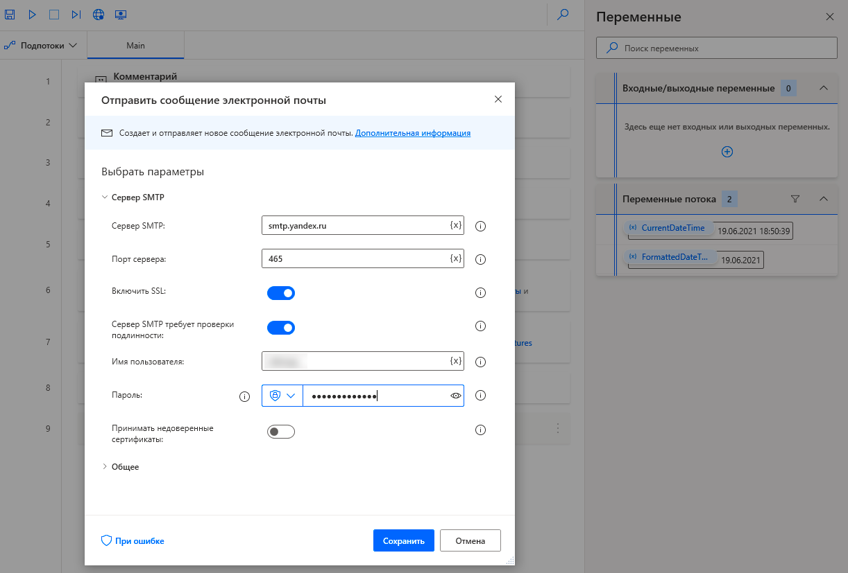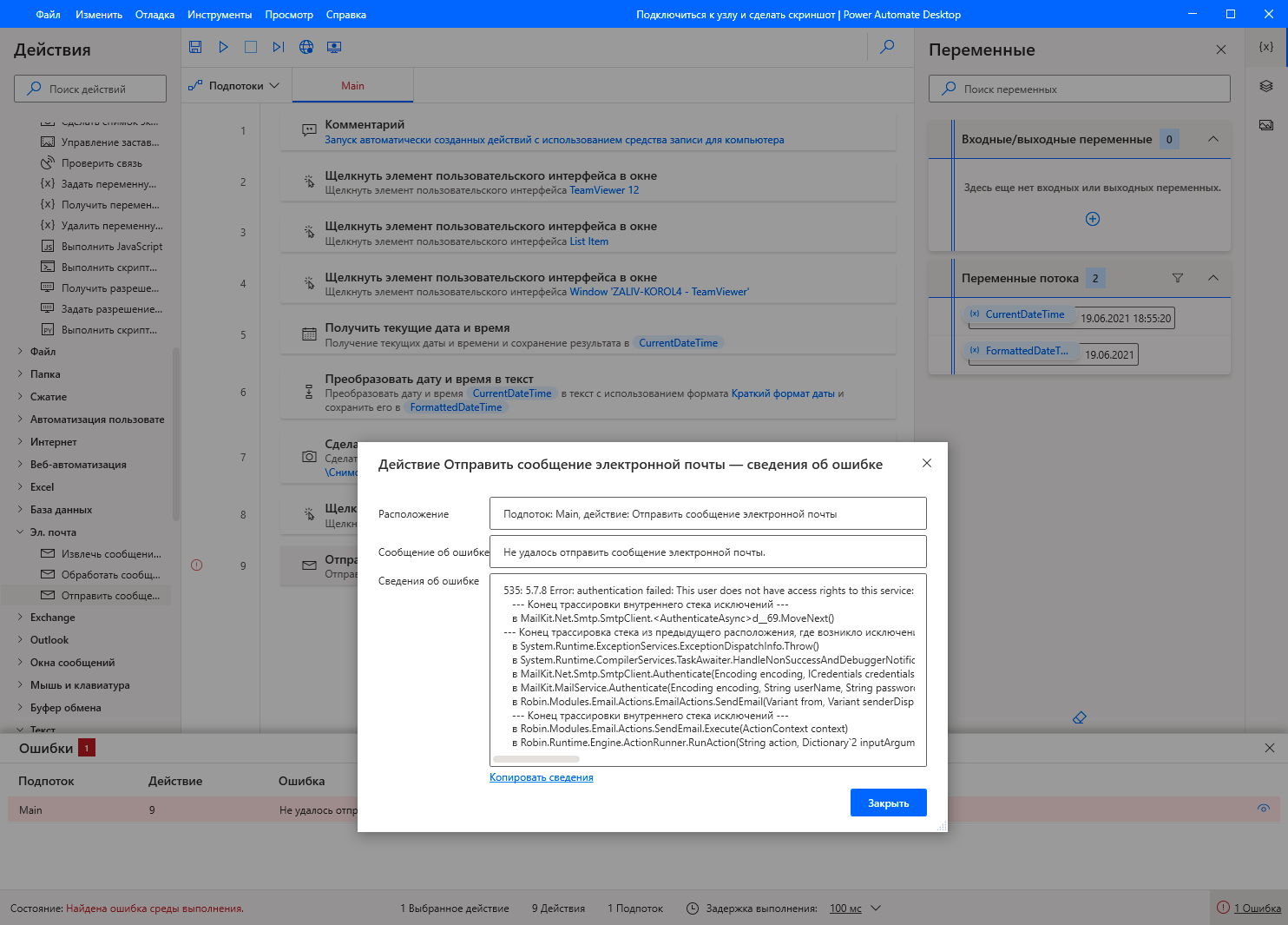 Теперь немного приберёмся за собой. Выделим последнее действие потока и снова запустим Средство записи для компьютера, включим запись и закроем окно подключения к узлу и сам TeamViewer. Убедимся, что лишних действий в запись не попало, а сами они расположены там, где нужно. Теперь перейдем в группу Эл. почта и добавим действие Отправить сообщение электронной почты. В разделе Сервер SMTP укажем параметры подключения к почтовому серверу.