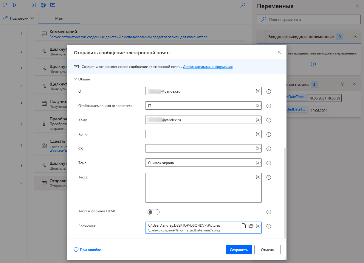 В разделе Общее заполняем само сообщение электронной почты: от кого, к кому, тема письма и т.д. В поле Вложения указываем путь к файлу скриншота точно также как он указан в действии Сделать снимок экрана.