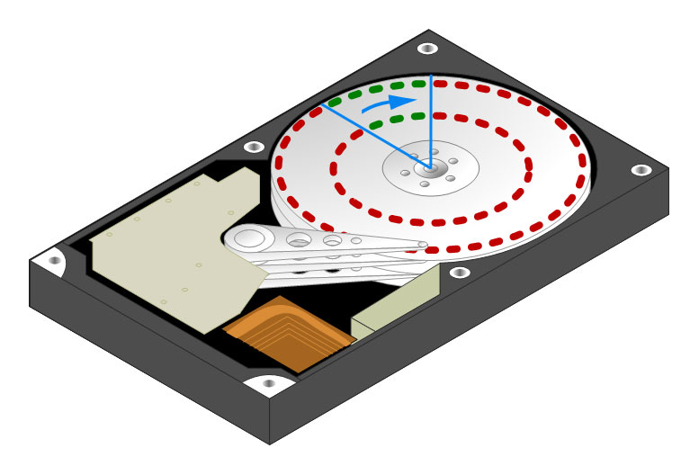 Во время вращения диска сектора проходят мимо блока магнитных головок, которые осуществляют запись или чтение информации. Скорость вращения (угловая скорость) диска в конечный момент времени величина постоянная, однако линейная скорость различных участков диска различна. У внешнего края диска она максимальна, у внутреннего - минимальна. Рассмотрим следующий рисунок: