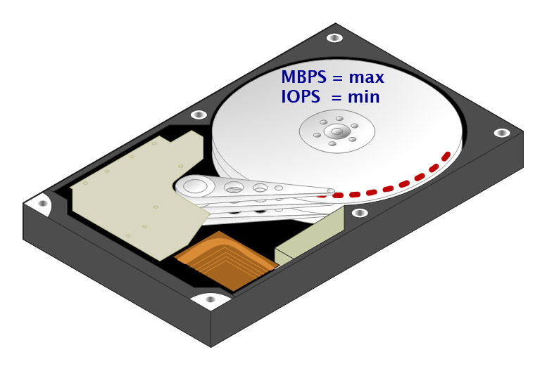 Реальная производительность жесткого диска - это всегда баланс между скоростью обмена данными и количеством операций ввода вывода. Для последовательного чтения характерен большой размер пакета данных, который считывается за одну операцию ввода вывода. Максимальная скорость (MBPS) будет достижима при последовательном чтении секторов с внешнего края диска, количество операций ввода-вывода (IOPS) будет при этом минимально - дорожки длинные, позиционировать головку нужно реже, данных при этом считывается больше. На внутренних дорожках линейная скорость будет ниже, количество IO - выше, дорожки короткие, позиционировать головку нужно чаще, данных считывается меньше.