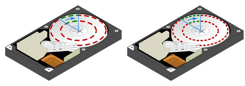 Теперь разберем прямо противоположную ситуацию, нам требуется считать большое количество небольших файлов случайным образом разбросанных по всему диску. В этом случае количество операций ввода-вывода будет велико, а скорость обмена данными низка. Основное время будет занимать ожидание доступа к следующему блоку данных, которое зависит от времени позиционирования головки и задержки из-за вращения диска. Простой пример: если после 100 сектора поступит команда прочитать 98, то придется ждать полный оборот диска, пока появится возможность прочитать данный сектор. Сюда же следует добавить время, которое требуется чтобы физически прочитать нужное количество секторов. Совокупность этих параметров составит время случайного доступа, которое имеет очень большое влияние на производительность винчестера.