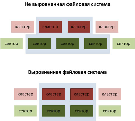 Появление дисков с более крупным 4 Кб сектором стало причиной появления еще одной проблемы: выравнивания файловой системы относительно секторов диска. Здесь возможны два варианта: если файловая система выровнена, то каждому кластеру соответствует сектор, если не выровнена, то каждому кластеру соответствует два смежных сектора. А так как сектор это минимальная адресуемая единица, то для считывания одного кластера потребуется считать не один, а два сектора, что негативно скажется на производительности, особенно при случайном доступе.