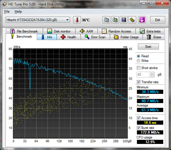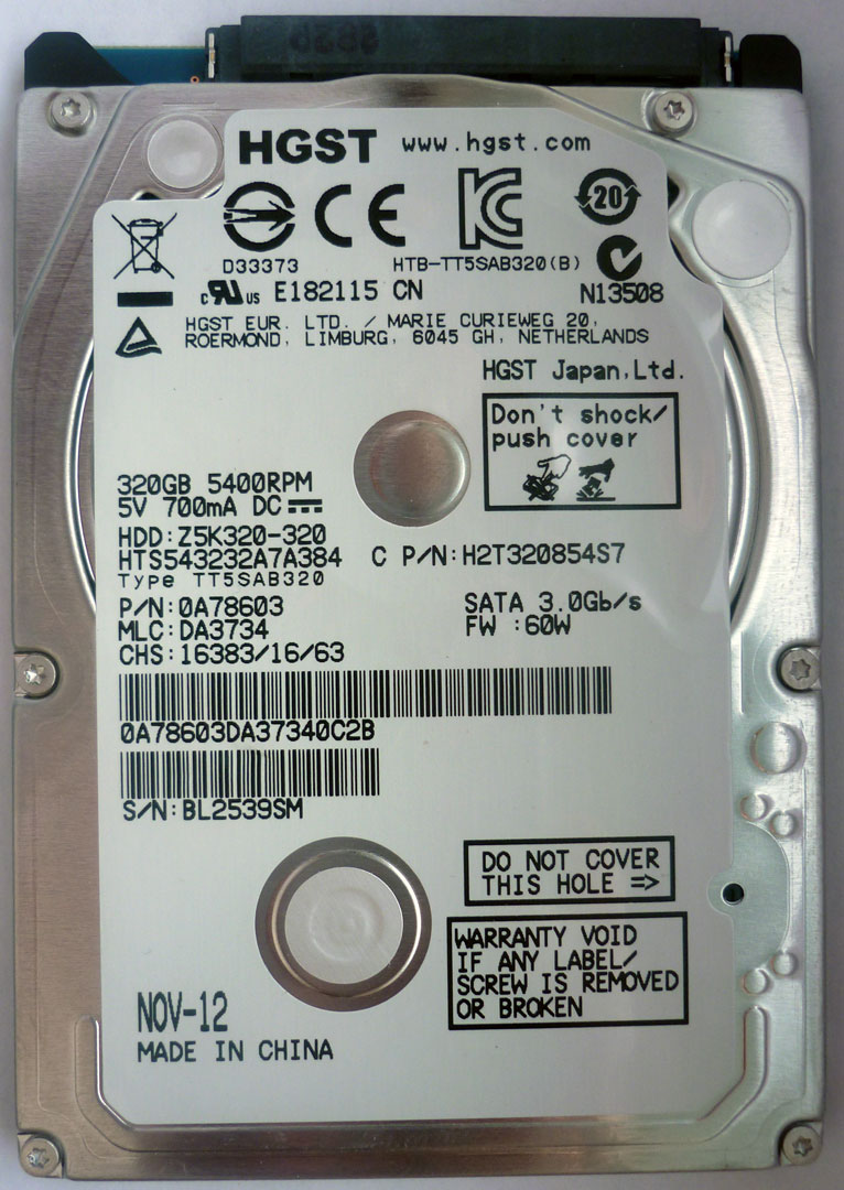 На этот раз в нашу лабораторию попал самый обычный жесткий диск 320 Gb SATA-II Hitachi Travelstar Z5K320 (HTS543232A7A384) 2.5" 5400 rpm 8Mb, стоимостью 1352 руб. Стоимость хранения 1 Гб составляет 4,23 руб, что несколько дороже массовых дисков 3,5", но вполне нормально для форм-фактора 2,5". Следует помнить, что в силу меньших размеров магнитных дисков, при той же плотности записи емкость ноутбучных дисков будет всегда меньше, при сопоставимых затратах на изготовление одного экземпляра.