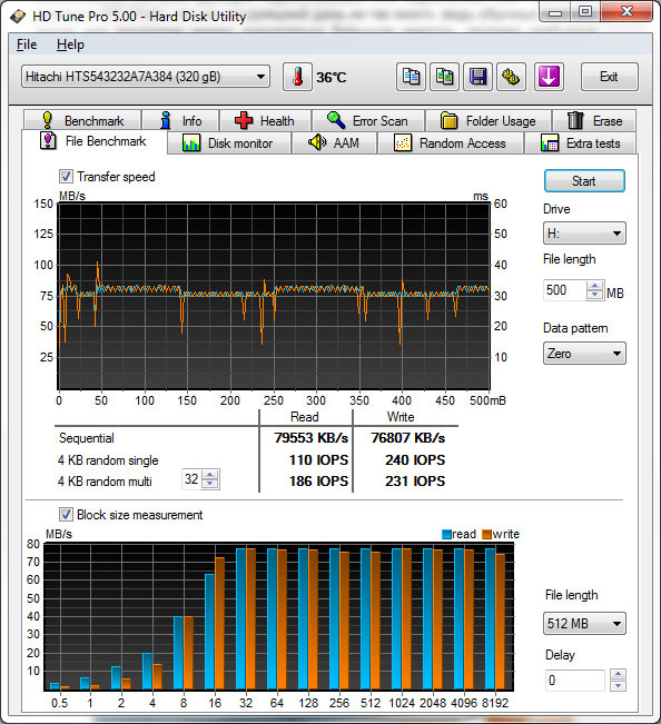 Первый тест подтвердил предыдущие результаты, диск не отличается высокими скоростными показателями и имеет довольно высокое время доступа, которое к концу диска достигает достаточно больших величин.