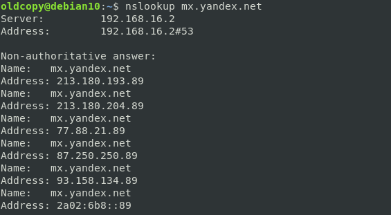 Обратите внимание, что оно отличается от адреса, к которому мы подключались. Это связано с тем, что почту могут обслуживать несколько серверов и при обращении к домену mx.yandex.net каждый раз будет выдаваться разный адрес, для распределения нагрузки между серверами. В этом несложно убедиться, выполнив еще раз команду nslookup, без аргументов она сообщит нам А-записи, которые соответствуют адресам серверов.