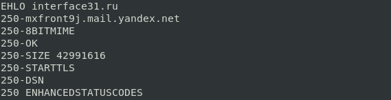 На приветствие сервер отвечает кодом 250 OK и сообщает поддерживаемые SMTP-расширения, это означает что сервер готов к получению почты.