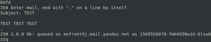 В ответ мы получим сообщение с кодом 354, которое разрешит нам ввод письма, которое следует закончить точкой с новой строки.
