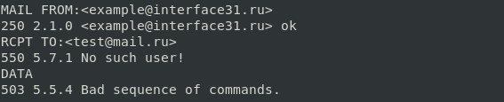 В данном случае все закончилось быстро, сервер сообщил нам с кодом 550 5.7.1 No such user! , что такого пользователя не существует, а когда мы попытались упорствовать, сообщил с кодом 503 5.5.4 Bad sequence of commands о неверной последовательности команд.