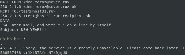 Для проверки мы отправили сообщение с подделанным отправителем и сразу же получили ошибку 451 4.7.1 Sorry, the service is currently unavailable. Please come back later.