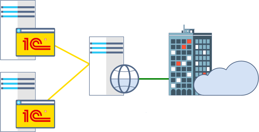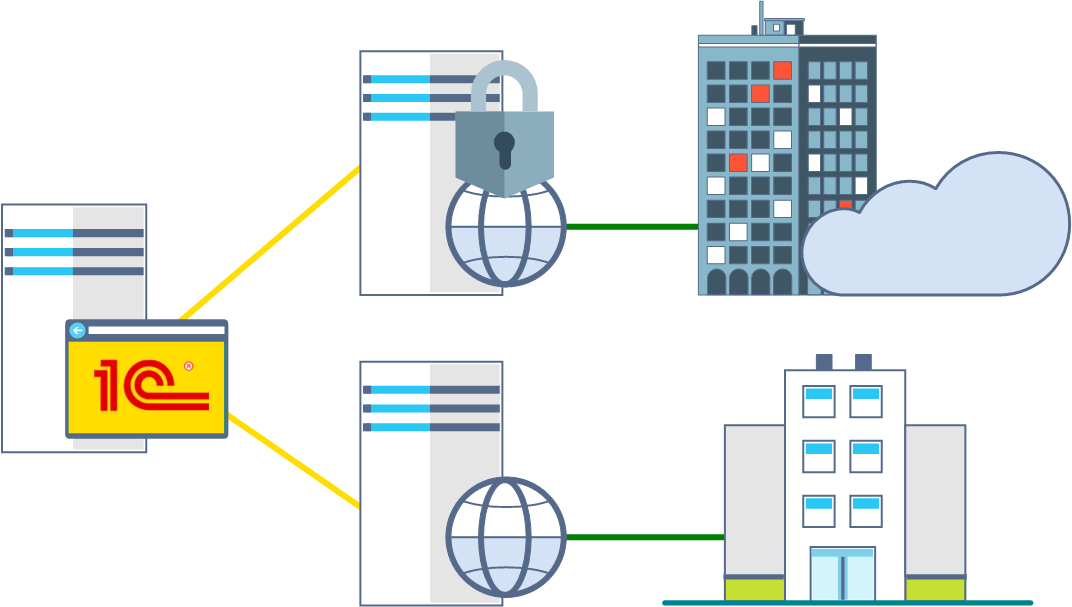Возможна также и иная схема, когда несколько веб-серверов работают с одним сервером 1С. Это оправдано, когда следует разделить набор доступных баз и обеспечить разный уровень безопасности, высокий для внешних пользователей и стандартный для внутренних, либо обеспечить балансировку нагрузки.