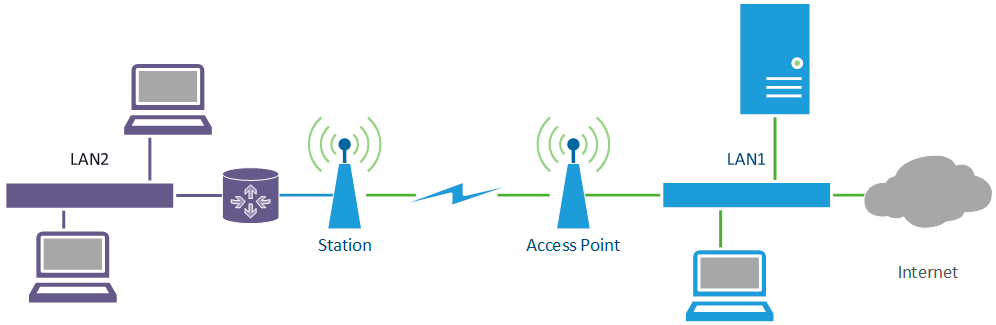 Но в данном режиме беспроводной интерфейс не является прозрачным для L2 трафика, даже если вы поместите его в мост и объединить сети на канальном уровне таким образом не получится. Для того, чтобы устройства сегмента LAN2 на схеме ниже могли получить доступ к сегменту LAN1 или интернету вам потребуется маршрутизатор (роутер) один из сетевых интерфейсов которого будет работать в режиме беспроводной станции.