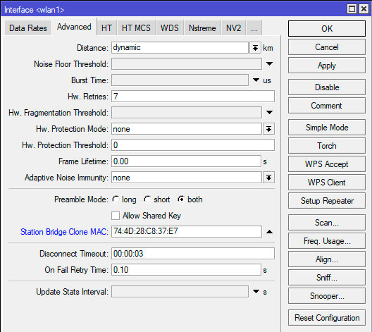 Для указания MAC-адреса клиента перейдите на закладку Advanced беспроводного интерфейса и заполните поле Station Bridge Clone MAC.