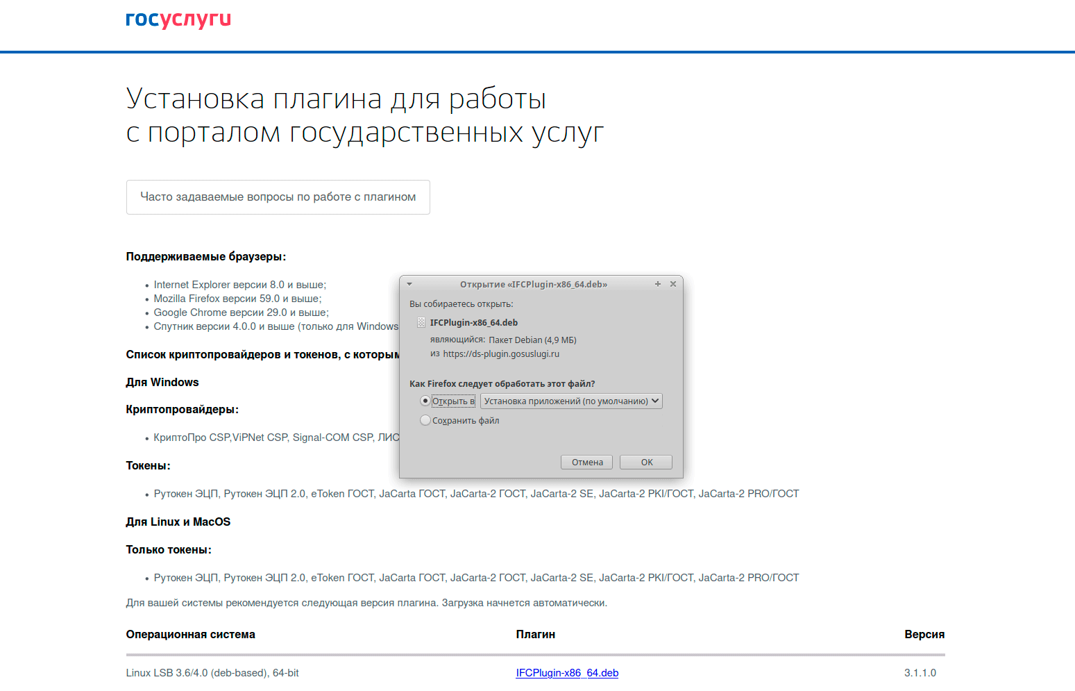 Основной по своей значимости портал для взаимодействия с государственными органами. Для входа на Госуслуги в Linux можно использовать только аппаратные ключи (токены), криптопровайдеры не поддерживаются. Поэтому если вам нужны только Госуслуги, то Крипто-Про вам устанавливать не нужно. Для работы с Госуслугами вам потребуется IFCPlugin, который можно загрузить со следующей страницы, на нее же вы будете перенаправлены автоматически при попытке входа с помощью электронной подписи без установленного плагина.