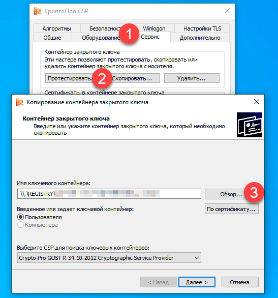Теперь пару слов о ключах, если они располагаются на токене или флеш-карте, то ничего делать не надо, а вот если они находятся в реестре, то их нужно скопировать на переносной носитель (флешку). Для этого откройте Крипто-Про и перейдите на вкладку Сервис, в разделе Контейнер закрытого ключа нажмите Скопировать и в открывшемся окне выберите нужный контейнер из реестра.