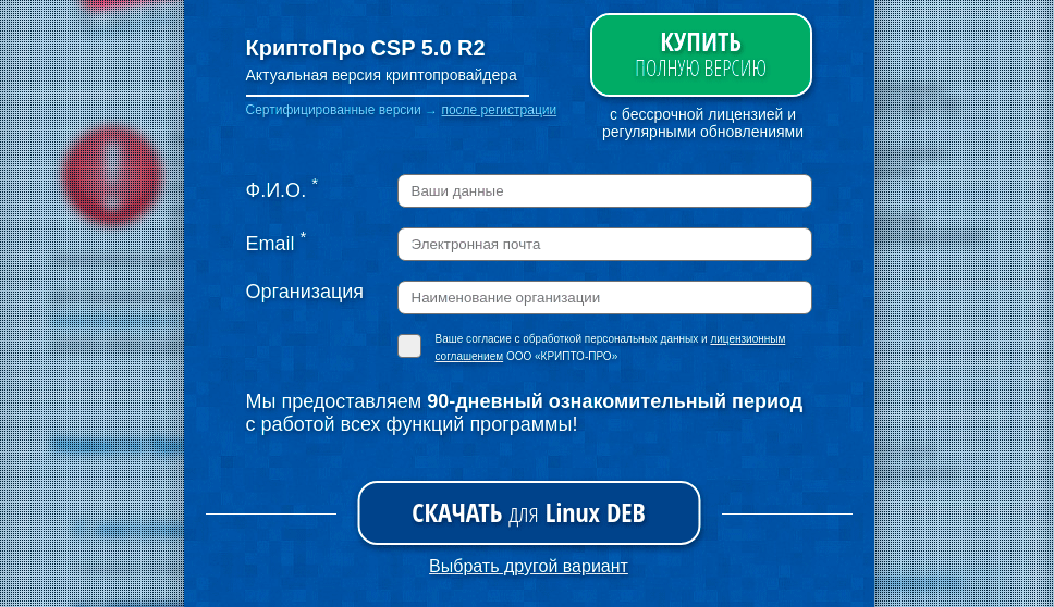 В этом случае вам не потребуется полноценной регистрации, достаточно будет заполнить несколько полей, сайт корректно определяет ОС клиента и сразу предлагает скачать нужный пакет, обратите внимание, что Крипто-Про для Linux поддерживает только 64-разрядные системы.
