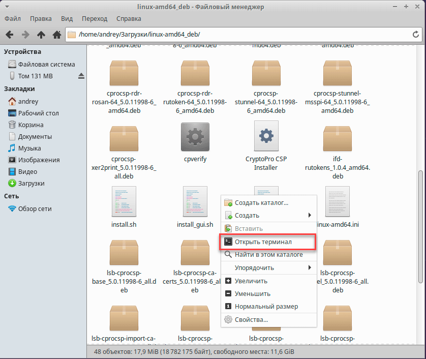 Распакуйте полученный архив в любое удобное место и перейдите в терминал, этом можно сделать, кликнув правой кнопкой мыши в любом свободном месте и выбрав Открыть терминал.