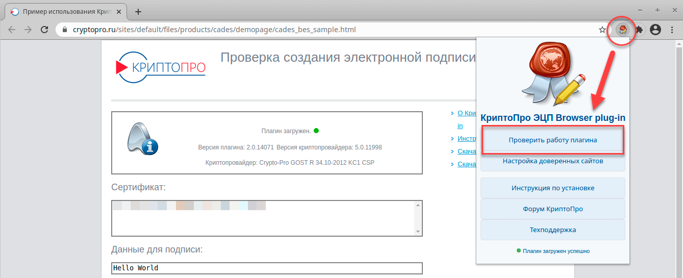 Затем перезапустим браузер и проверим работу плагина. Для этого нажмите на значок плагина на панели браузера и выберите в выпадающем меню Проверить работу плагина, если все сделано правильно вы увидите следующую страницу: