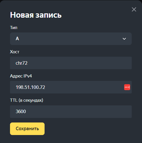 Для получения сертификата Let's Encrypt вам понадобится доменное имя и выделенный IP-адрес, если у вас уже есть собственный домен, то можете создать нужный поддомен и в A-записи для него указать выделенный адрес роутера. Эти изменения вносятся на DNS-сервере, обслуживающем ваш домен. Например, запись может выглядеть так (формат BIND):