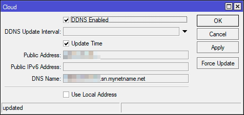 Если собственного доменного имени нет или выделенный адрес является динамическим, то можно использовать встроенную службы DDNS в Mikrotik. Для этого перейдите в IP - Cloud и установите флаг DDNS Enabled, через некоторое время вы получите уникальное доменное имя для роутера.
