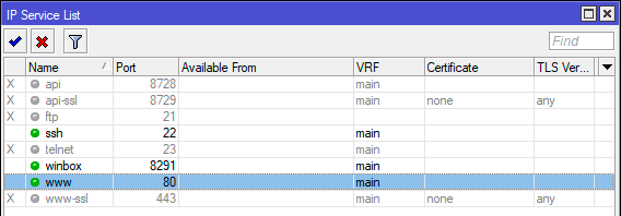 Для работы с Let's Encrypt нам потребуется веб-сервер и открытый для доступа извне 80 TCP порт. А вот здесь начинаются первые особенности, веб-сервер в RouterOS неразрывно связан с webfig, т.е. веб-интерфейсом для настройки роутера и вам придется его включить в IP - Services: