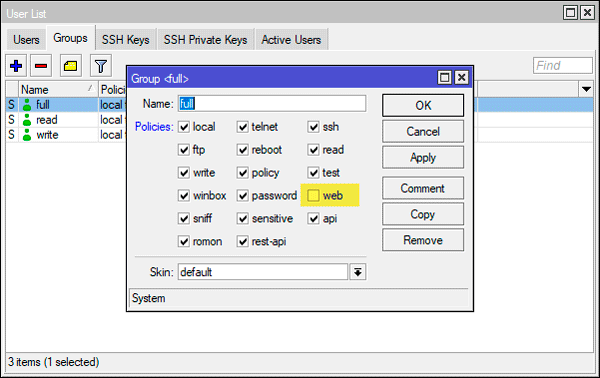 Поэтому, прежде чем открывать доступ, убедитесь, что все ваши пользователи имеют надежные пароли. Также можно подстраховаться и запретить вход в webfig всем или выбранным категориям пользователей. Для этого перейдите в System - Users и в открывшемся окне, на вкладке Groups для всех или только выбранных групп снимите в разрешениях флаг web.