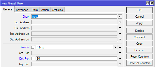 Все, что нам осталось - это создать разрешающее правило для входящего трафика на 80 порт. Переходим в IP - Firewall и создаем правило: Chain - input, Protocol - 6 (tcp), Dst. Port - 80. Так как действие по умолчанию - accept, то никаких дополнительных действий делать не нужно. После создания обязательно добавьте ему комментарий, например, HTTP.