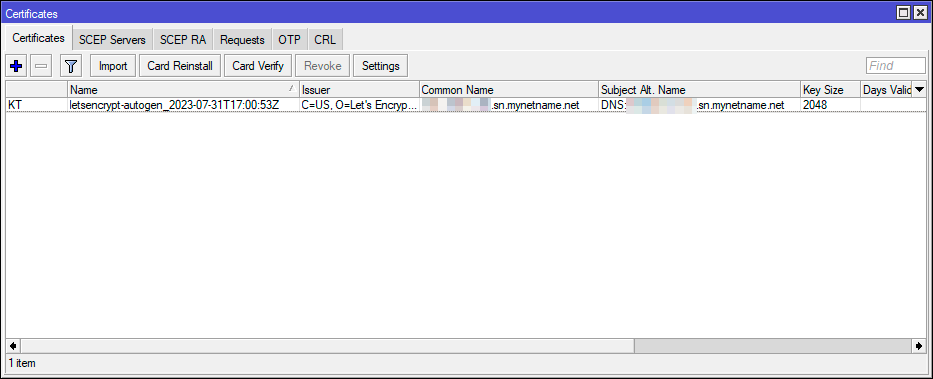 Полученный сертификат можно увидеть в System - Certificates, он будет иметь имя вроде letsencrypt-autogen_2023-07-31T17:09:41Z и флаги KT.