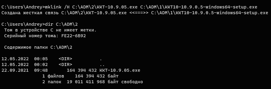 Где ключ /H предписывает создать именно жесткую ссылку, далее следует путь к новому файлу и целевому файлу, на который мы делаем ссылку. Путь можно указывать как абсолютные, так и относительные, в имени создаваемого файла не забывайте указывать расширение.