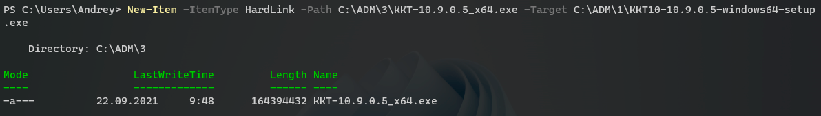 Команда другая, но принцип тот же самый: -ItemType - тип создаваемой ссылки, в нашем случае жесткая ссылка, -Path - путь к создаваемому файлу ссылки, -Target - файл на который мы делаем ссылку.