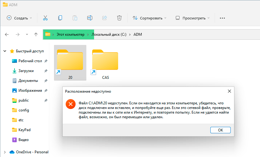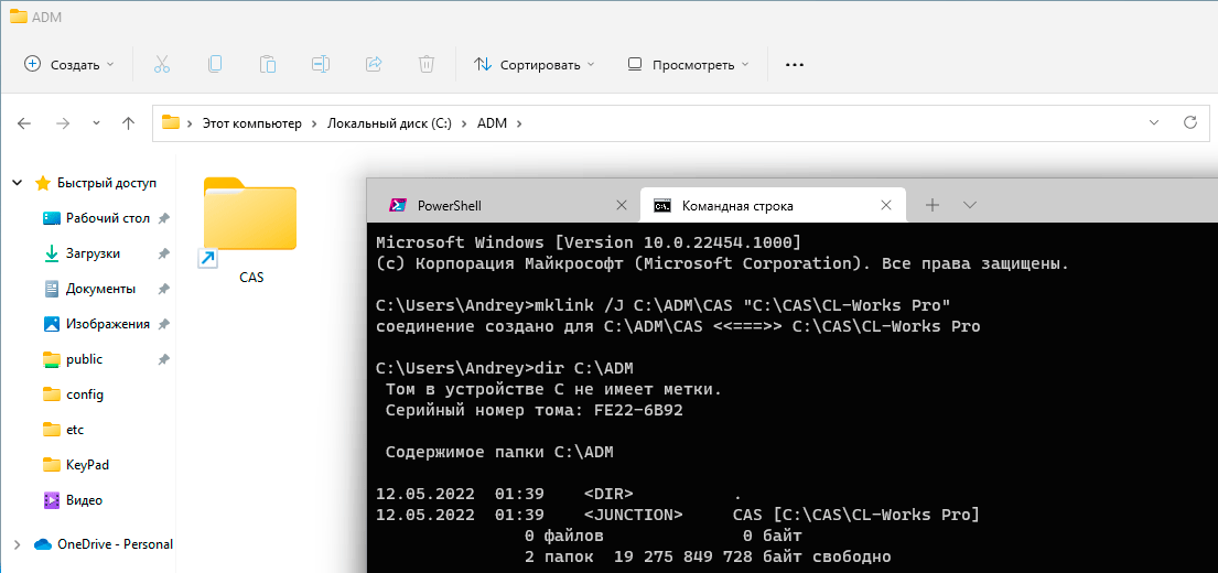 Обратите внимание, что данная папка в проводнике отображается как ярлык, а выводе команды dir как точка соединения.
