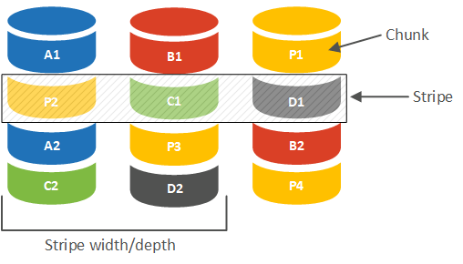 Каждая полоса содержит либо набор данных, либо данные и их контрольные суммы, которые вычисляются на основе данных каждой такой полосы. Глубиной или шириной полосы (Stripe width/depth) называется объем данных, содержащийся в каждой полосе.