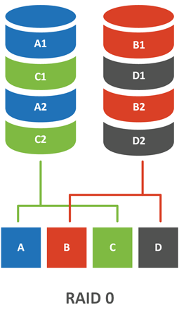 Перейдем, наконец от теории, к разбору конкретных реализаций RAID. Из всех вариантов RAID 0 - единственный тип массива, который не содержит избыточности, также его еще называют чередующимся массивом или страйпом (Stripe).