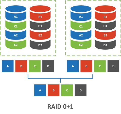 Так как внешним массивом является RAID 1 - зеркало, то на оба вложенных чередующихся массива подается одинаковый набор данных, который распределяется без избыточности по дискам массива. В итоге получаем два одинаковых RAID 0 массива, которые собраны в зеркало.