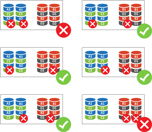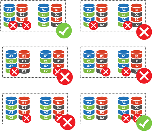 Для массива из четырех дисков (а это минимальное количество для этого уровня RAID) у нас есть шесть вариантов отказа двух дисков. Исходя из того, что отказ из любого диска RAID 0 является для него фатальным, то получаем 4 отказа из 6 или 66,67%. Т.е. при потере двух дисков вы потеряете свои данные с вероятностью 66,67%, что довольно-таки много.