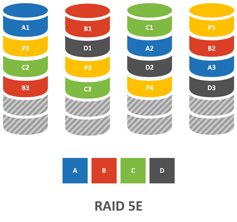 RAID 5E предлагает иной подход, пространство резервного диска разделяется между остальными дисками и остается неразмеченным в конце каждого диска массива.